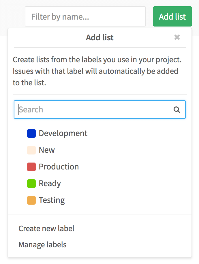 List | Each label that exists in the issue tracker can have its own dedicated list. Every list is named after the label it is based on and is represented by a column which contains all the issues associated with that label. You can think of a list like the results you get when you filter the issues by a label in your issue tracker. |