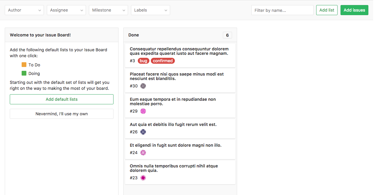 The first time you navigate to your Issue Board, you will be presented with a default list (Done) and a welcoming message that gives you two options. You can either create a predefined set of labels and create their corresponding lists to the Issue Board or opt-out and use your own lists.