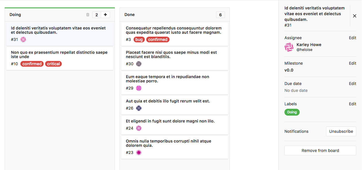 Card | Every card represents an issue and it is shown under the list for which it has a label. The information you can see on a card consists of the issue number, the issue title, the assignee and the labels associated with it. You can drag cards around from one list to another. Issues inside lists are ordered by priority. |